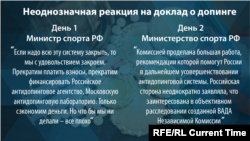 Российские спортивные власти называют обвинения голословными, но обещают разобраться и говорят о приверженности борьбе с допингом. После громких заявлений министра спорта сразу после публикации доклада, опубликованный на следующий день официальный пресс-релиз выдержан в гораздо более спокойных формулировках.